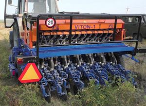 Ширина захвата «VITON-1» – 2 м, вес – 3 т, сеялка агрегатируется с тракторами МТЗ-80, 82 и их аналогами, одновременно высевает семена основной культуры, бинарный компонент, вносит минеральные удобрения. Расстояние между двухдисковыми сошниками – 16,5 см, регулируемая ширина междурядья – от 16,5 до 48 см. Объемы бункеров: для зерновых культур – 313 л, для удобрений – 330, для мелкосемянных культур – 37 л. Оптимальная скорость при посеве – 8 км/ч, производительность – 17 - 20 га в смену. Для более крупных хозяйств разработана сеялка «VITON-2» с шириной захвата 5,4 м, ее производительность – 25 - 30 га в смену».