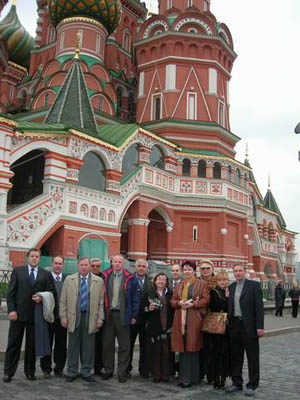 На снимках: встреча с делегацией в центральном офисе фирмы «Август»; гости из Беларуси на Красной площади; на стенде Института картофелеводства НАН Беларуси – селекционер И. И. Калядко.