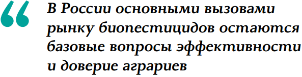 Кроме того, необходимо учитывать структуру пестицидного рынка в России: подавляющая доля применяемых средств защиты растений – это гербициды, тогда как биопестициды представлены в основном фунгицидами и инсектицидами. Поэтому, когда с высоких трибун иногда звучат заявления о том, что 50 % всей защиты урожая в ближайшее время будет обеспечено биопрепаратами, остается только пожимать плечами и сомневаться в том, что люди, излагающие такие идеи, реально оценивают ситуацию на полях.