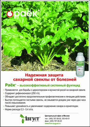 Фирма «Август» выпускает два препарата для борьбы с церкоспорозом - фундазол, СП (500 г/кг) и раëк, КЭ (250 г/л). Фундазол (д. в. беномил) применяется с нормой расхода препарата 0,6 - 0,8 кг/га, кратностью обработок до двух и сроком ожидания 40 дней, раëк (д. в. дифеноконазол) – соответственно 0,4 л/га, 2 обработки и 20 дней.