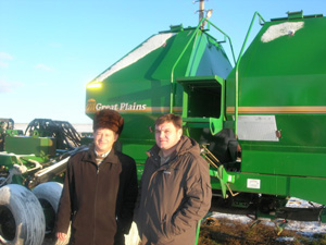 Канадскими стерневыми дисковыми пневматическими сеялками «Great Plains» с шириной захвата 10 м. Неплохие агрегаты, каждый уже тысяч по шесть гектаров засеял, суточная выработка – около 120 га. Рабочий орган состоит из турбодиска, диска и катка. Из-за большой протяженности агрофирмы (почти 100 км) технику приходится часто перегонять, большие комплексы для нас не подходят, а эта – в самый раз.