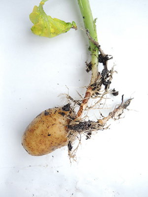 На стеблях патоген проявляется в виде сухой язвенной гнили бурого цвета. Такие язвы могут полностью опоясать стебель и даже захватить большую его часть. Гриб поражает сосудисто-проводящую систему растения, что приводит к низкорослости, увяданию, скручиванию и фиолетово-красному окрашиванию вдоль центральной жилки листьев картофеля, а также к образованию воздушных клубней в пазухах листьев.