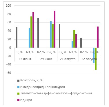 По всем датам учетов наилучшим защитным действием и наивысшей эффективностью среди сравниваемых препаратов обладал Идикум. Все испытанные препараты не проявили фитотоксичности для картофеля.