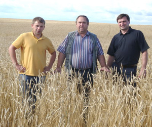 «Хороша пшеница!». Слева направо: аспирант А. В. Трубников, руководитель подразделения «Екатериновское» А. Н. Ануфриев и С. В. Кирюшин