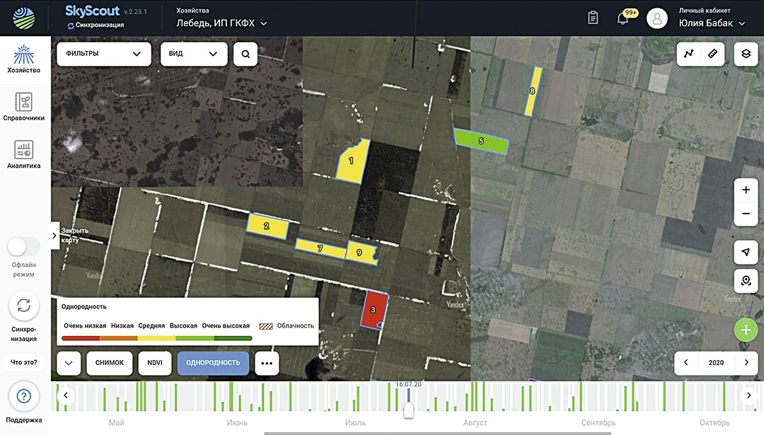В арсенале программы – хороший набор инструментов спутникового мониторинга, который позволяет быстро оценить состояние всего массива полей в хозяйстве или отдельных участков. Так, например, очень полезным инструментом для анализа является индекс неоднородности. Он позволяет оценить, насколько поле однородно (неоднородно) в пределах границ. Высокая степень неоднородности указывает на какие-либо отрицательные события: наличие повреждений посевов, связанных с болезнями или стихийными факторами, нарушения при проведении агротехнических мероприятий и т. д.