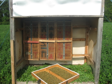 Укрытие с ульями и лотками для пчел-листорезов на семеннике люцерны в ОАО «Воля»