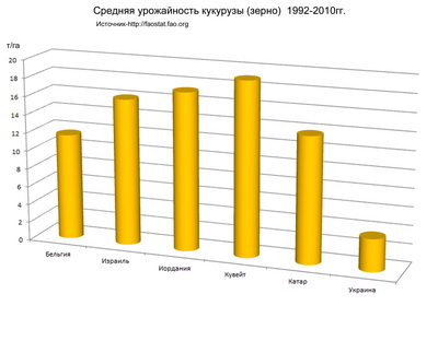 Рис 1. Средняя урожайность кукурузы на зерно по данным ФАО