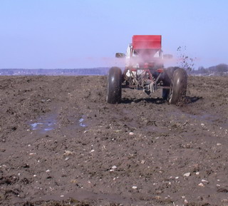 Полезная грузоподъемность машины – 1 т. Ширина захвата 16 - 20 м. Разбрасывание туков осуществляется на фиксированных скоростях 20, 25 или 30 км/ч с двух центробежных дисков, которые находятся над задними колесами на высоте 140 см. В конструкции используются легкие и надежные рассеивающий и дозирующий механизмы фирмы «Rauch». Диапазон подкормочных доз гранулированных и кристаллических удобрений – от 40 до 300 кг/га. Так как высота загрузки разбрасывателя 2,4 м, наиболее удобным вариантом является использование загрузчиков сеялок, выполненных в виде заднего борта автотракторного самосвала со шнековым транспортером и гидрораспределителем. Наличие в составе комплекса «Роса-05» разбрасывателя минеральных удобрений делает его практически всесезонным. В 2008 году несколько хозяйств Минской области вносили калийные удобрения в январе.
