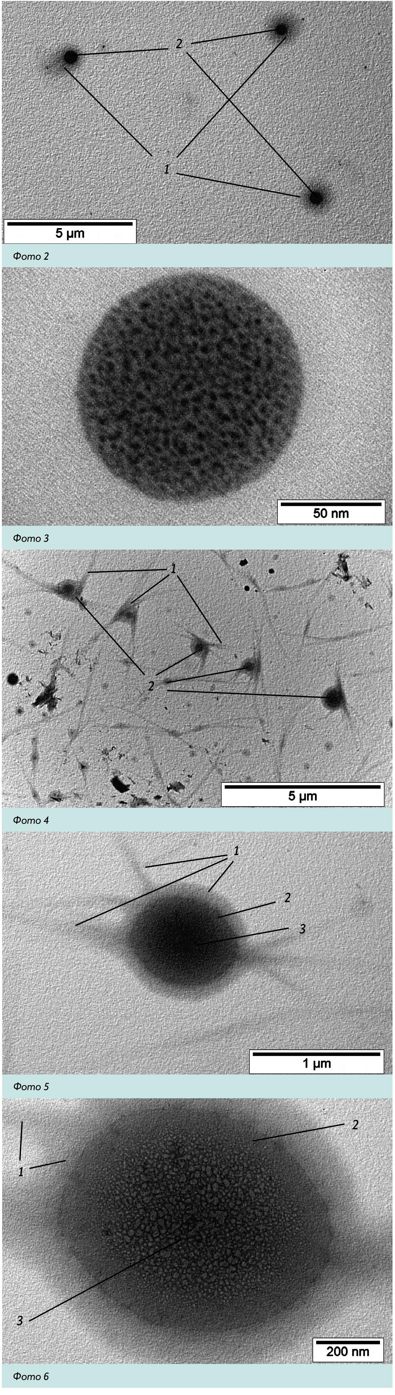 Фото 1 - 3 иллюстрируют микроскопию Колосаля Про: на фото 1 мы видим четкие мицеллы сферической формы, заполненные смесью д. в. (для получения контрастного черного цвета в образец добавлен раствор соли уранила). На фото 2 видна структура мицеллы: 1 – внешний слой – это слой молекул ПАВ (серый цвет), 2 – внутренняя полость мицеллы, заполненная смесью д. в. На фото 3 отчетливо видно равномерное наполнение внутреннего пространства мицеллы смесью д. в. (контраст обеспечило добавление в образец раствора соли уранила).