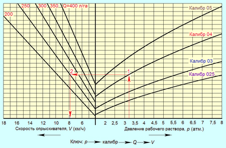 Скорость опрыскивателя. Для определения оптимальной скорости движения опрыскивателей предлагаем использовать номограмму (рис.), которая выполнена в рекомендуемом диапазоне давления рабочего раствора (1,5 - 8 атм) используемых в полеводстве калибров распылителей 025 - 05. С помощью номограммы по установленным значениям калибра распылителей, давления р и расхода рабочего раствора Qопределяют скорость опрыскивателей V, не выполняя расчетов. Последовательность действий при пользовании номограммой устанавливается ее ключом: р → Калибр → Q→ V.
