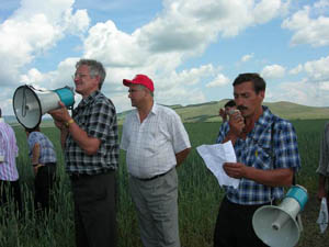 На снимках: Л. Д. Островский и А. Е. Казанцев (слева направо) рассказывают о ходе испытаний в ЗАО «Атланта»; на этой делянке зерна получено свыше 40 ц/га; Ю. Н. Анашкин, Г. И. Кийков, А. А. Каличенко с участниками Дня поля на сортоучастке в ООО «Истоки».