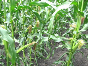 22 июня Юрий Янковский сообщает: «Вчера провел осмотр поля кукурузы. Прошло 12 дней со дня моего последнего визита. За это время ситуация существенно изменилась. Прошли дожди. За период с 7 по 21 июня выпало 30,6 мм. Это сказалось на кукурузе весьма благоприятно. Теперь фаза развития растений – 13 -14 листьев, высота в среднем – 1,2 м. Химических обработок по защите растений от насекомых и вредителей пока не проводилось. В начале второй декады июня была проведена внекорневая подкормка кукурузы (баковая смесь в физическом весе: мочевина, 7 кг/га + моноцинк, 0,7 кг/га). Чистота посева на хорошем уровне, о чем свидетельствуют представленные ниже фотографии. Однако хочется отметить наличие кое-где небольших очагов мари белой (на момент обработки этот сорняк перерос чувствительную фазу). Правда, он уже не составляет конкуренцию культуре, так как сильно угнетен и отстал в росте».