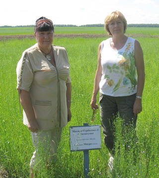 На снимках: Л. М. Захарова (слева) с ведущим менеджером фирмы «Август» М. В. Лазуриной осматривают опытные посевы льна; защищенные посевы.