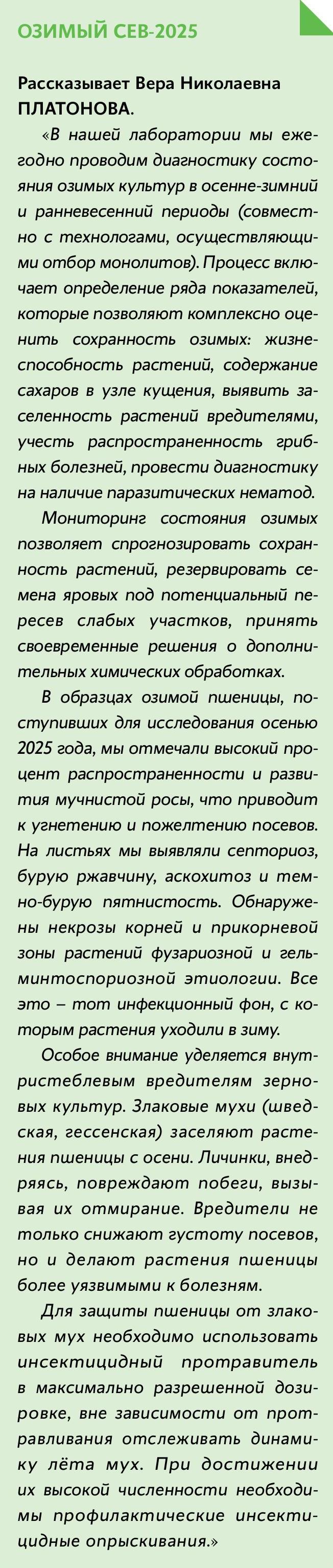 В. Н. Платонова: Технологам известна история конкретного поля в хозяйстве – какие были предшественники, какие болезни и вредители на нем ранее обнаруживали и др. Однако зачастую технологи наблюдают влияние комплекса причин: повреждения насекомыми-вредителями и механические, последствия климатических факторов. Патогены могут взаимно влиять друг на друга, одни симптомы – маскировать другие. Нужно отличать пятнистости неинфекционного характера от начального проявления листовых болезней. В растительных пробах присутствует смешанная инфекция, например, симптоматика сетчатой и темно-бурой пятнистостей на листьях ячменя, пятна с пикнидиальным спороношением как септориоза, так и аскохитоза на листовом аппарате пшеницы и т. д.