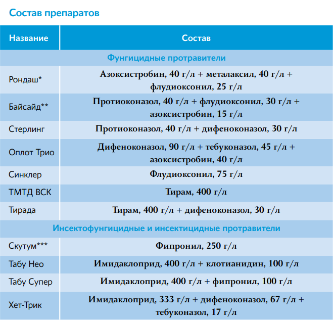 В большинстве случаев при протравливании также необходимо применять инсектицидный компонент против вредных насекомых: например, имидаклоприд, клотианидин, фипронил.