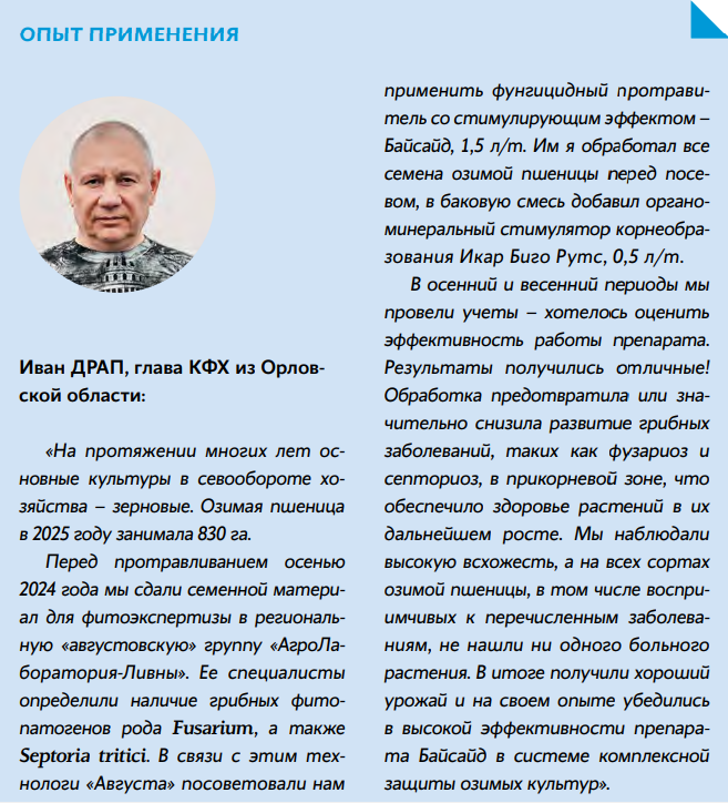 Ведущий специалист отдела развития продуктов «Августа» Владимир ПЕШЕХОНОВ: «Самое сбалансированное решение по выбору протравителей против грибных инфекций – препарат Байсайд, а для контроля вредителей стоит добавлять к нему инсектицидный компонент – Табу Нео. При работе с озимой пшеницей, имеющей длительный период роста, мы рекомендуем применять эти препараты в максимальных нормах – Байсайд, 1,5 л/т и Табу Нео, 1 л/т. Еще одно хорошее решение – использовать смесь протравителей Хет-Трик, 1,5 л/т + Синклер, 0,6 л/т.