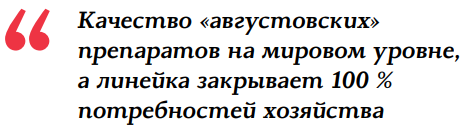 Качество «августовских» препаратов на мировом уровне, а линейка закрывает 100 % потребностей хозяйства. У компании развитая технологическая поддержка. Нас консультируют грамотные специалисты – начальник технологического отдела ЗАО ТД «Август» Иван Яцкевич и Алексей Чендаков – агроном-консультант ООО «АгроАнализ-Бел» (прим. ред.: генеральный дистрибьютор «Августа» в РБ).