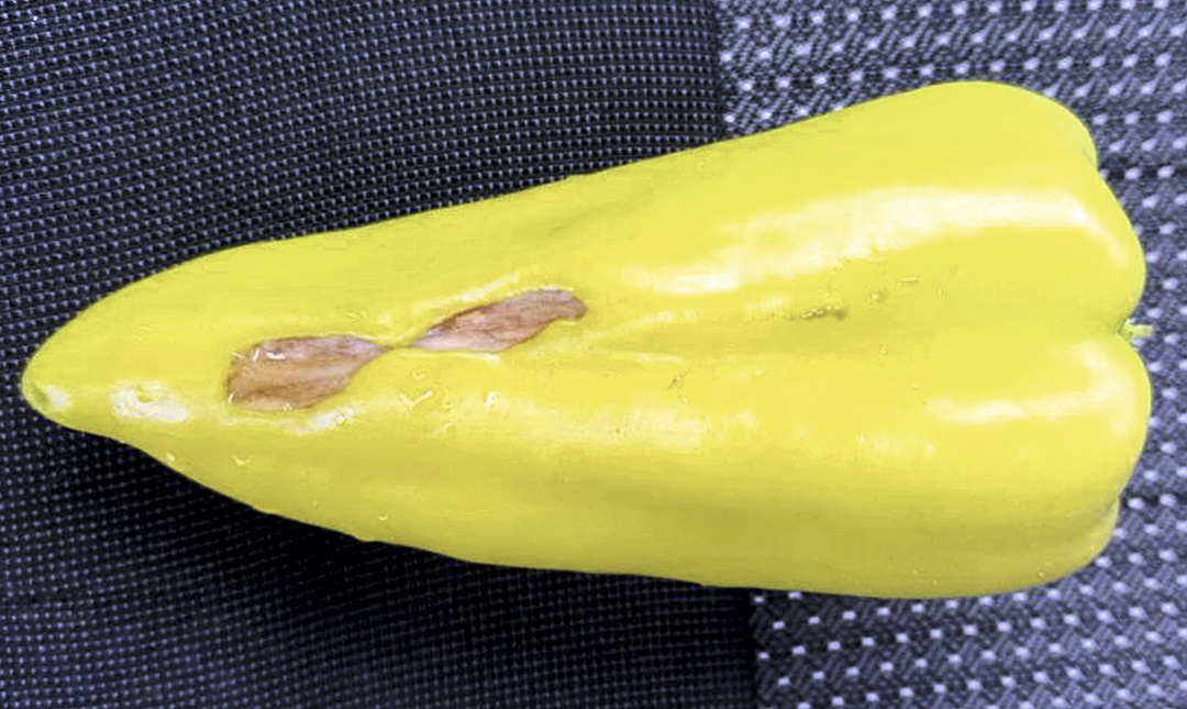 Повреждение перца солнечным ожогом всегда находится на внешней стороне плода и имеет поверхностный, пленчатый характер