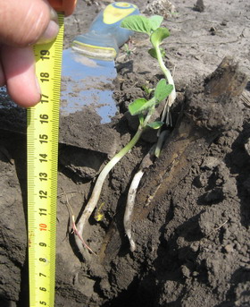 Иногда не получают заданную густоту стояния растений культуры еще и из-за плохой подготовки почвы и чрезмерно глубокой заделки семян. Известно, что семена сои имеют надземное прорастание и выносят подсемядольное коленце семядоли на поверхность почвы. Поэтому недопустима заделка семян на глубину более 7 - 8 см (фото 1), традиционно оптимальная глубина заделки семян – 4 - 5 см. Если мы не получим оптимальной для сорта густоты посева, то все остальные агроприемы по контролю сорняков будут малоэффективны (фото 2).