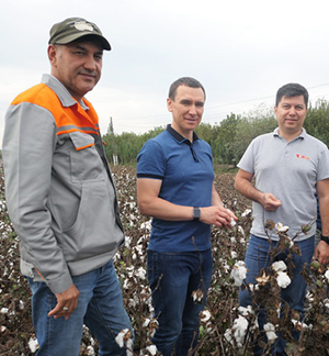 На поле хлопчатника «Uztex Group» Слева направо: М. Мансуров, М. Халиуллин и Р. Тавхидов