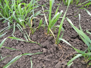 В фазе первого листа культуры была определена площадь листовой поверхности на разных вариантах. В 2009 году на яровом ячмене ее потеря в контрольном варианте достигала 40 % по сравнению с опытными участками, а на яровой пшенице – 25 %. Обработка семян Табу в норме расхода 0,4 - 0,5 л/т позволила обеспечить эффективную защиту посевов яровых зерновых в критический период роста от 1 до 5 листьев.