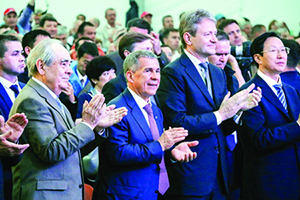 Открытие Дня поля. Слева направо: М. Шаймиев, Р. Минниханов, А. Ткачев, Хань Чанфу