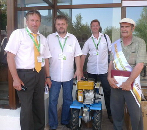 Команда «Августа» на Дне поля Н. В. Дергунов (слева) рассказывает о системе защиты зерновых; Вручение подарка от фирмы «Август» – мотоблока – победителю конкурса пахарей В. Л. Воронину (крайний слева)