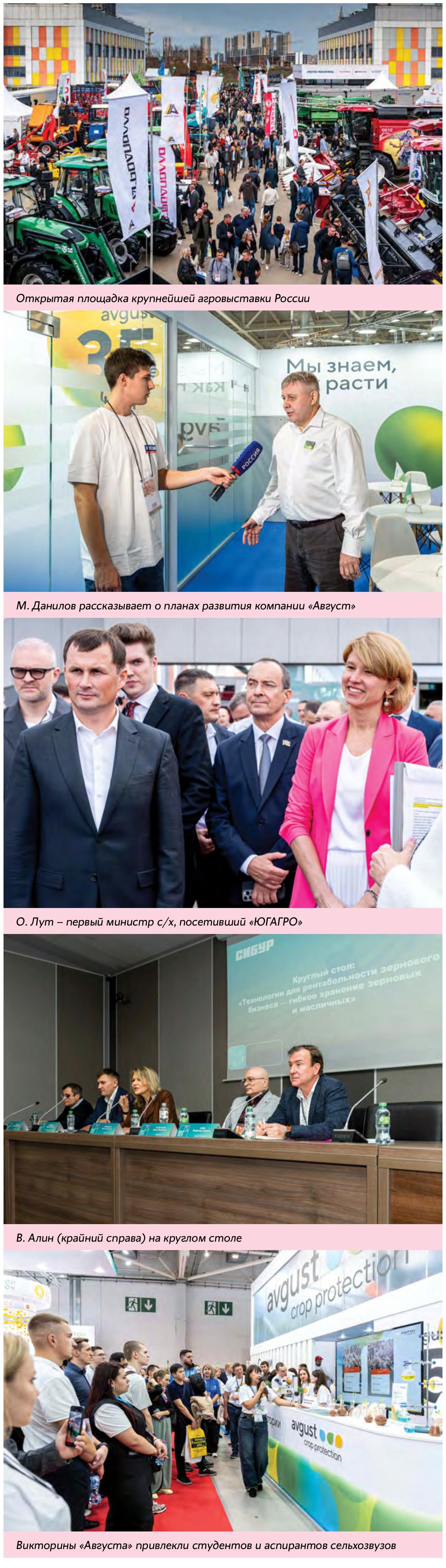 О. Лут отметила значимость выставки для повышения эффективности и рентабельности агробизнеса: «Мы сегодня выяснили, что на «ЮГАГРО» ранее не присутствовал ни один министр сельского хозяйства. И мне объективно очень интересно посмотреть, что это такое, как воспринимается нашим профессиональным сообществом «ЮГАГРО» – самая крутая выставка средств производства для растениеводства. Это основная отрасль АПК России, она развивается каждый год, но делать это становится все тяжелее. Российский агросектор должен работать на снижение себестоимости растениеводческой продукции, чтобы продукты питания были доступны для наших граждан, а мы – конкурентоспособны на внешнем рынке. Уверена, что все участники мероприятия найдут для себя что-то новое, интересное, полезное для повышения эффективности и рентабельности своего бизнеса». «АВГУСТ»