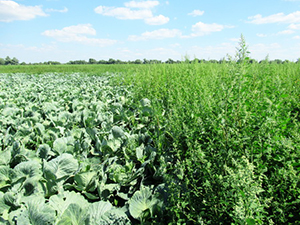 Третья гербицидная обработка была проведена из-за разнообразия новых всходов сорных растений. В посадках присутствовали вторая «волна» мари белой, отросший повой заборный, горец шероховатый, паслен черный, просо куриное, горчица полевая. В этот период на посадках также стали появляться вредители: капустная белянка, капустная моль и волнистая блошка.