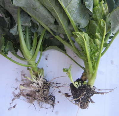 На фото 1 можно увидеть, как неумеренные обработки цветной капусты регуляторами роста ауксиновой группы привели к образованию на корнях множества замещающих побегов. В нормальном цикле развития культуры это невозможно, ибо на корневой системе капусты почек нет. На фото 2 – невозможно одновременно стимулировать и рост и созревание – после обработки стимулятором созревания Этефоном рост прекращается, куст усыхает. Фото 3 иллюстрирует действие этилена – стимулятора созревания плодов. Обработка его парами всего за сутки заставит покраснеть даже абсолютно зеленые плоды. Если при этом в камере не будет хорошей вентиляции, то плоды краснеют неравномерно, образуя вот такие «красные шапочки».